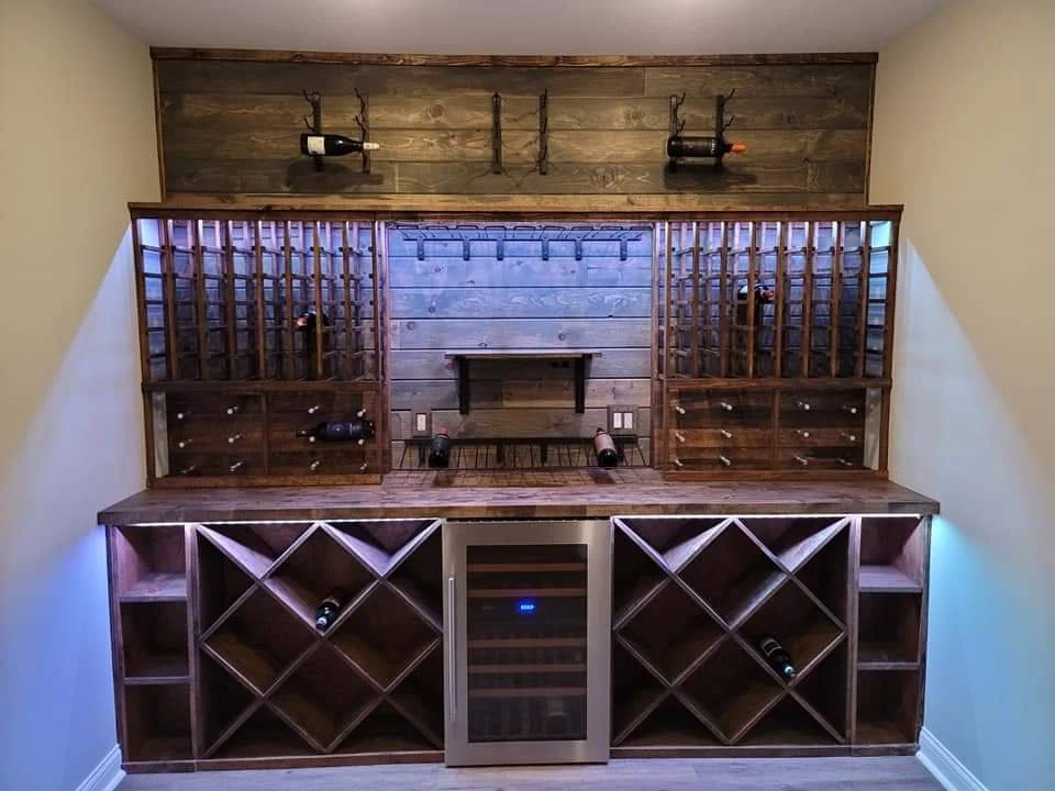 Our client here needed additional wine storage space and we were happy to accommodate! Complete with a T&G accent wall, butcher block counter tops, and hidden spot and backlighting (with selectable colors).
